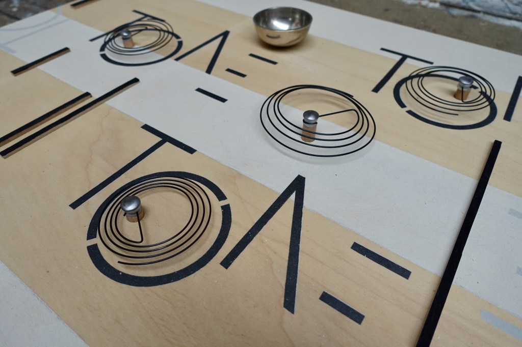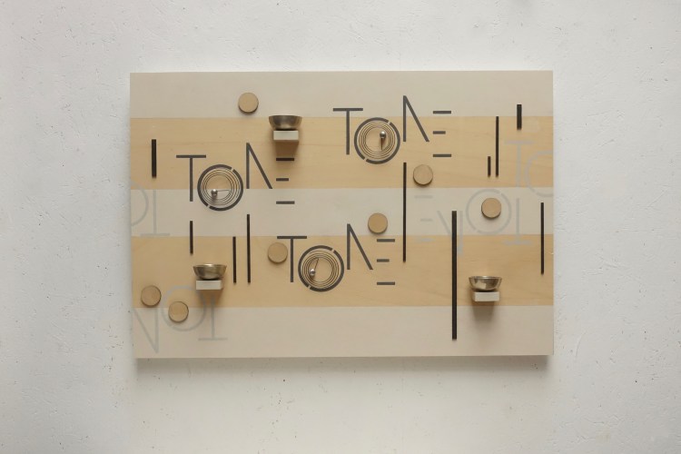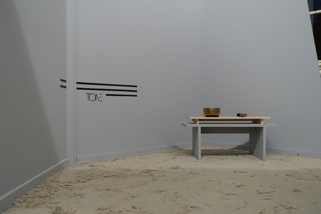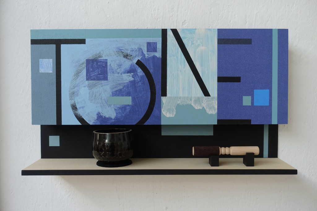 Inner Space inner Tone, installation (part), De Spanjaardshof 2018.Inner Space inner Tone, installation (part), De Spanjaardshof 2018.Chinese temple bell tone (2019) acryl / temple bell / stick / wood 33 x 60 cmTone elements 2018 acryl/sound bowls/gong elements on wood 60 x 89 cmDetail Tone elements 2018Noise tone (white)(2018) acryl/wood 23 x 122 cmTone in blue (2017) acryl/wood 30 x 122 cmDiptych tone (2017) acryl/wood 2 parts, 50,5 x 76 cm